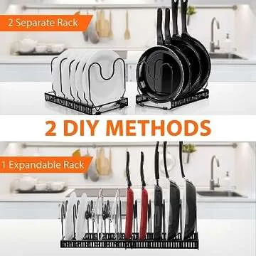 AHNR Expandable Pot and Pan Organizers Rack, 10+ Pans and Pots Lid Organizer Rack Holder, Kitchen Cabinet Pantry Bakeware Organizer Rack Holder with 10 Adjustable Compartments (Black)