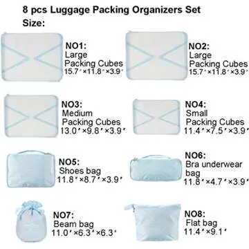 This set includes a total of 8 pieces: 4 packing cubes, 1 bra underwear bag, 1 shoes bag, 1 flat bag, and 1 beam bag.