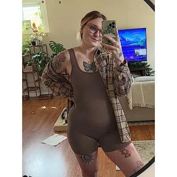 AIBIANOCEL Women's Maternity Bodysuit Pregnancy Shapewear Sleeveless Tank Top Shorts Ribbed Romper Jumpsuit(Coffee,Medium)