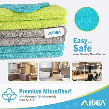 Show more Introducing the AIDEA Microfiber Cleaning Cloths - 50PK — your ultimate cleaning solution! This pack of 50 ultra-soft, scratch-free microfiber cloths is designed to elevate your cleaning experience. Measuring a generous 12x16 inches, these towels are not only ample in size but also meticulously crafted to ensure that they won't scratch or damage even the most delicate surfaces. Whether you’re tidying up stainless steel appliances, polishing glass, or wiping down kitchen counters, AIDEA's microfiber cloths deliver exceptional results without leaving streaks or lint behind.