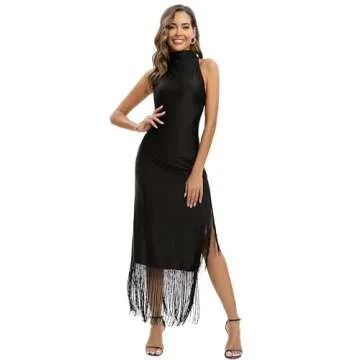 Show more Step back in time and embrace the glamour of the roaring 1920s with the Aigeman Women Vintage Flapper Dress. This exquisite piece combines historic charm with modern comfort, making it an essential addition to any wardrobe. Crafted from a lightweight blend of 86% Polyester and 14% Spandex, this dress ensures maximum comfort without sacrificing style. The breathable fabric allows for ease of movement, ensuring you stay comfortable whether you’re dancing the night away or enjoying a casual dinner. The halter high neck and sleeveless design elevate this dress, while the high slit and beautiful tassel hem enhance its sophisticated allure.