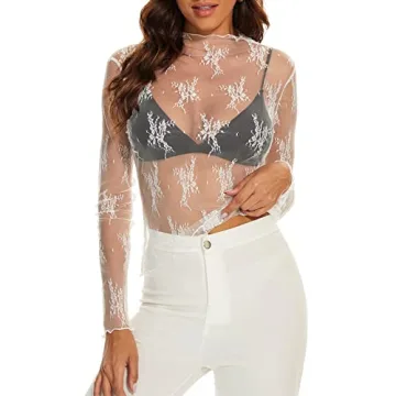 AILBBE Mesh Long Sleeve Layering Top for Women - Mock Neck & Floral Embroidery Blouse (White, S)