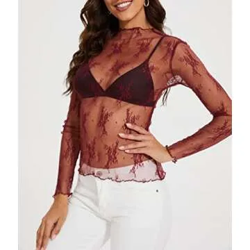 AILBBE Mesh Long Sleeve Layering Top for Women Mock Neck Floral Embroidery Sheer See Through Tee Shirt Blouse (as1, Alpha, s, Regular, Regular, Purplish Red)