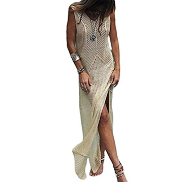 AILUNSNIKA Women Apricot Sexy Sleeveless Crochet Knitted Dress Hollow Out Side Slit Long Tank Bikini Cover Up