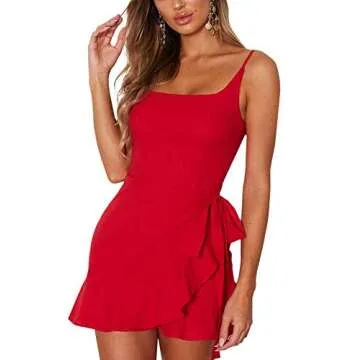 AIMCOO Women's Casual Ruffle Hem Solid Wrap Dress Spaghetti Strap Front Tie Knot Short Dresses Red