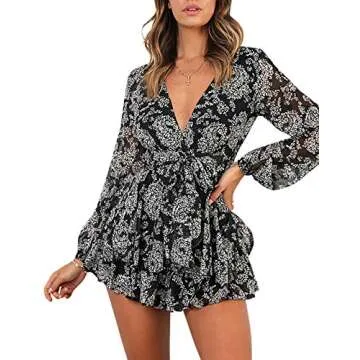 AIMCOO Women's Floral Print Deep V-Neck Romper Double Layer Ruffle Hem Jumpsuits Long Baggy Sleeves Waist Tie Short Rompers