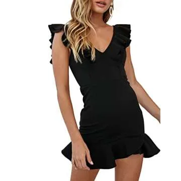 AIMCOO Women's Summer Flutter Sleeve Mini Dresses V Neck Sexy Bodycon Dress Ruffle Hem Zipper Back Solid Short Dress Black
