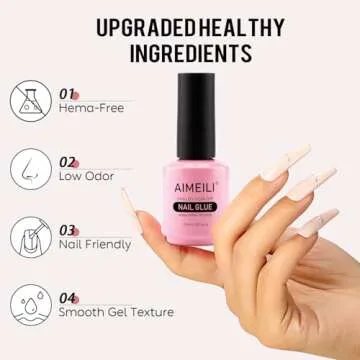 Show more Transform your nail game with the AIMEILI 2 in 1 Nail Glue and Base Gel! This multifunctional marvel is not just a nail adhesive; it doubles as a base coat, making it an essential for both DIY enthusiasts and professional nail technicians alike. With its impressive formulation, this 15ml bottle is designed to provide a strong bond for acrylic nails, false nails, and press-ons while ensuring a healthier nail experience. Unlike traditional nail glues, AIMEILI harnesses a natural formula that minimizes harm to your nails, offering a low-odor option that enhances your comfort as you create stunning nail designs.