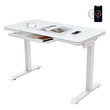 Show more Discover the ultimate in ergonomic design with the AIMEZO Standing Desk with Drawer. Crafted with a stunning tempered glass tabletop that measures 45.07 x 23.1 inches, this desk not only provides a sleek aesthetic to your workspace but also features impressive functionality that blends seamlessly with any office or home decor. Ideal for those who value both style and practicality, the desk showcases a premium build constructed with dual motors that enable effortless height adjustments from 27.95 inches to 46.06 inches. The full metal structure offers a solid foundation, ensuring that your workspace remains sturdy and reliable while supporting up to 110 lbs of weight. What sets it apart further is the integrated touchscreen controller, which boasts 7 programmable buttons and 3 memory presets for personalized height settings, making it easier to alternate between sitting and standing throughout your day.