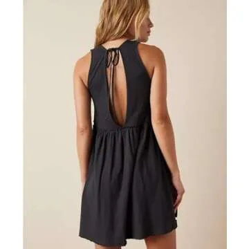 Aimiray Women's Casual Sleeveless Mini Dress Loose V Neck Backless Pleated Short Tank Sundress with Pockets(Black-L)