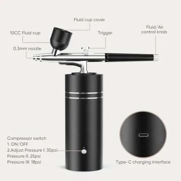 This airbrush comes equipped with a 0.3mm fluid tip that minimizes overspray, allowing for intricate detailing on any surface. It features multiple paint cups (10CC, 20CC, 40CC) and five cleaning brushes, making it user-friendly and ideal for both beginners and seasoned artists alike. The internal mixing system ensures a seamless blend of colors, guaranteeing smooth and consistent results every time you spray.