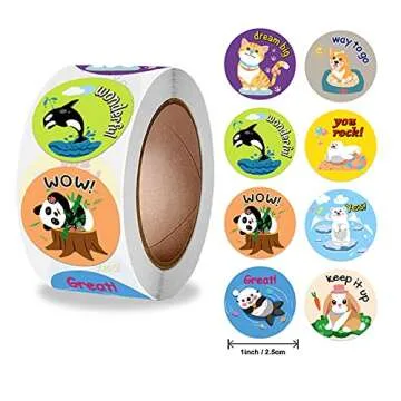 Show more Discover the joy of motivation and creativity with Aisatisforu Cute Animal Reward Stickers! This delightful roll features 500 pieces of engaging round stickers, each measuring 2.5 cm (1 inch) in diameter, adorned with 8 unique animal designs that include playful sea lions, adorable polar bears, cheerful whales, and more! Perfect for classrooms, these stickers are not just decorative; they serve as a motivational tool that encourages children to strive for excellence in school! Bright colors and charming illustrations are sure to brighten up any learning environment.