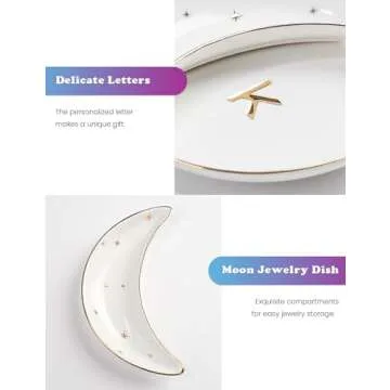 AISBUGUR Initial Jewelry Dish Set of 2, 4.9" Personalized Ceramic Jewelry Tray for Women,Monogrammed Ring Dish Engagement Gift with a Moon Tray for Her -k