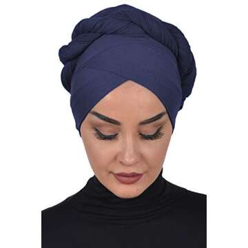 Show moreElevate your style with Aisha's Design Instant Turban Hijab Scarves, crafted with 95% premium combed cotton for an ultra-soft and breathable experience. This luxurious navy blue head wrap features a unique crosswise bonnet design that beautifully shapes your face while providing a contemporary twist to classic hijab styles. Perfect for day-to-night transitions, this versatile shawl can be effortlessly worn by simply tying it on, giving you a chic look without the hassle of complicated draping. With its healthy material, this shawl not only complements your wardrobe but keeps you comfortable throughout your busy day.