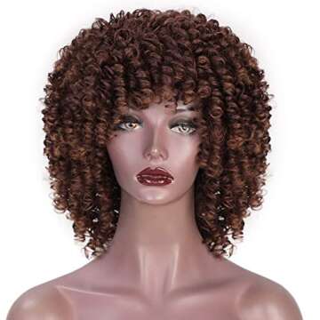 Show more Introducing the AISI HAIR Afro Wig, a stunning addition to your beauty collection designed specifically for black women who embrace their natural beauty. Featuring a vibrant ombre dark brown color adorned with luscious short curly curls and bangs, this wig seamlessly blends style and convenience. Crafted from high-quality synthetic fibers, it mimics the feel and look of natural hair while ensuring durability and style longevity. The heat-resistant quality allows for versatile styling, making it perfect for any occasion—from casual outings to formal events.