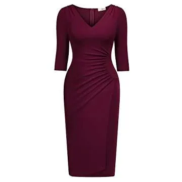 Show moreIntroducing the AISIZE Women's Classic V Neck 3/4 Sleeve Work Business Dress in a stunning burgundy hue, designed for the modern woman who values both style and comfort. This exquisite midi dress features a flattering v-neckline and elegant 3/4 sleeves, making it a perfect choice for various occasions—from daily wear to formal events. Crafted from a high-quality, slightly stretchy fabric, this dress promises endurance against wrinkles, ensuring you look polished throughout the day. The unique ruched design at the waist not only enhances your natural silhouette but also provides a sophisticated look that transitions seamlessly from the office to evening functions.