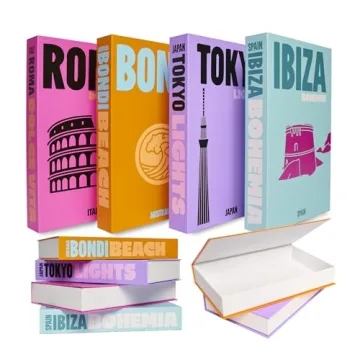 Show more Introduce a burst of color and creativity into any space with AISLE 3 ESSENTIALS A3E Preppy Room Decor Aesthetic Decorative Books. This stunning set of four faux books is not only an aesthetic marvel but also a clever storage solution that will delight everyone. Each piece boasts a unique design inspired by captivating destinations: Ibiza, Roma, Bondi, and Tokyo. Crafted with high-quality materials, these faux books are specifically created to mimic the charm of real books while adding a touch of preppy elegance to your decor. The secure magnetic seal keeps your treasures hidden yet accessible, allowing you to store small items such as jewelry, notes, or personal mementos effortlessly.