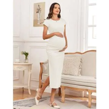 AISWI 2025 Spring Summer Women's Split Maternity Dress Short Sleeve Ruched Pregnancy Clothes Fine Ribbed Baby Shower Dresses, 1, Off White, Medium