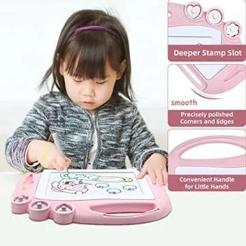 Show more Introducing the ultimate companion for your little artist: a delightful magnetic doodle board that guarantees hours of creative fun! This innovative drawing pad showcases a premium design made from non-toxic and BPA-free soft plastic, ensuring safety during playtime. Its lightweight nature allows children to effortlessly handle it, while its rounded edges and soft curves minimize any injury risks.
