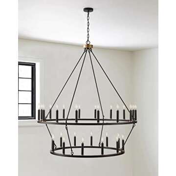 Show moreIlluminate your space with the enchanting Aiwen Farmhouse Black Wagon Wheel Chandelier, a stunning two-tier pendant light that blends rustic charm with industrial elegance. Measuring **47.24 inches** in diameter and **49.2 inches** in height, this captivating chandelier features a robust matte black metal body that houses **28 bulb bases**, allowing for a warm and inviting glow that transforms any room into a cozy oasis. The **candle-style design** evokes a sense of nostalgia and draws attention, making it the perfect centerpiece for your home decor.