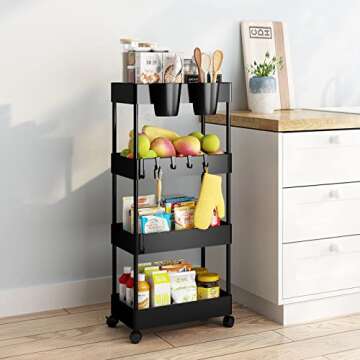 AIYAKA 4-Tier Rolling Utility Cart, with Wheels Multifunctional Storage Organizer, for Kitchen, Office, Home, School, Black
