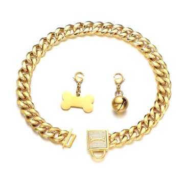 AIYIDI Heavy Duty Dog Chain Collar,18K Gold Stainless Steel Slip Choker Collar,with Rhinestone Safety Buckle,Dog tag,Dog Bell,Chew-Proof,Width 11/15/19mm Cuban Link Chain Collar,10-26inch(15mm,14in)