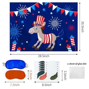 Show more Celebrate Independence Day with a splash of laughter and fun using the AiYuuve Independence Day Pin The Tail On The Donkey Game. This delightful party game infuses your Fourth of July gatherings with a spirited patriotic theme while offering endless entertainment for family and friends of all ages. Crafted with high-quality materials, the game includes a large, vibrant poster featuring a cheerful patriotic donkey adorned with fireworks, guaranteed to brighten up any party atmosphere. With 24 colorful tail stickers, two blindfolds, and dot glues for easy setup, you have everything needed for a classic competition that will have party-goers spinning with excitement!