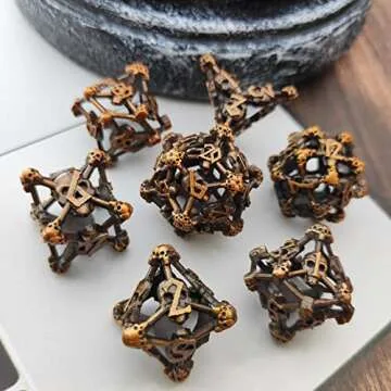 Show more Step into the thrilling world of tabletop gaming with the **AJKDEUIH Metal DND Skull Dice Set**. Designed for those who appreciate both aesthetics and functionality, this exquisite set features a unique hollow skull design that is sure to impress players and DMs alike! Crafted from high-quality brass, this set includes 7 beautifully crafted polyhedral dice (D20, D12, D10, D%, D8, D6, D4) encased in an elegant black leather bag. Every die is meticulously engraved with clear, easy-to-read numbers, ensuring a seamless gameplay experience while maintaining a captivating look.