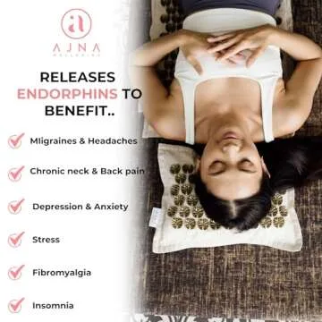 Show more Experience a revolutionary approach to wellness with the Ajna Luxe mat and pillow set. Crafted for those who value natural healing and comfort, this remarkable product offers a unique blend of acupressure and relaxation. Imagine laying on a bed of precision-engineered spikes, designed to release muscle tension and boost circulation, all from the comfort of your home. The Ajna Luxe, from the eco-conscious brand Ajna Wellbeing, is chiropractor-recommended, making it a reliable companion for anyone seeking relief from back pain, tension, or stress.