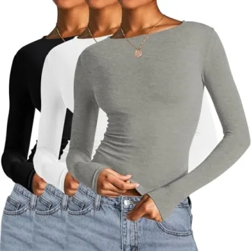 Show more Inject a pop of fashion into your wardrobe with the AKEWEI 3 Pack Womens 2025 Fashion Going Out Tops. These stylish long sleeve crop tops are designed to fit like a glove, delivering comfort *without compromising on style*. Featuring a buttery soft blend of 92% cotton and 8% spandex, each tee offers lightweight breathability and a stretchy, flattering silhouette. With a chic boat neckline and flattering slim fit, these tops are perfect for layering or wearing solo. Available in classic colors like Black, White, and Light Grey, they're a must-have for any fashionable woman looking to elevate her everyday style.