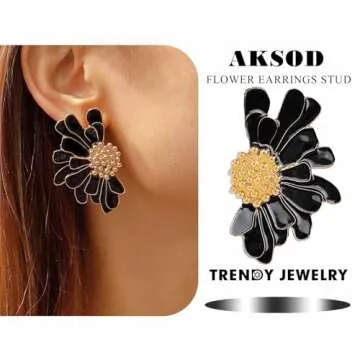 Aksod Boho Big Black Flower Earrings Enamel Large Daisy Floral Earrings Studs Vintage Trendy Summer Holiday Earrings Jewelry for Women (Black)