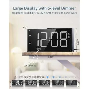 Show moreIntroducing the ultimate solution for heavy sleepers: the Alarm Clock for Bedroom with Dual Alarms, designed specifically for those who struggle to wake up on time. With its innovative features, including customizable weekday and weekend settings, this alarm clock makes mornings hassle-free. You can set two different alarms to suit your unique schedules, whether for weekdays, weekends, or everyday use. It’s perfect for couples or roommates, alleviating the need for multiple devices. The sleek 7.5-inch LED display features bold, easy-to-read font, ensuring you can check the time from across the room with minimal effort.