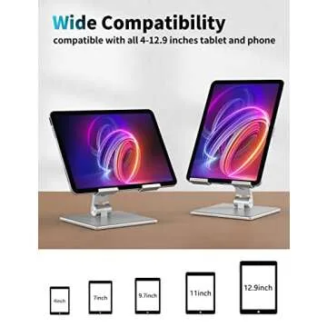 Show more This remarkable tablet stand offers the ultimate solution for all your tablet holding needs. Engineered with a strong metal body, it supports devices ranging from 4 to 13.3 inches, including popular models like the Apple iPad Pro 12.9, Microsoft Surface Pro, and Samsung Galaxy Tabs. No more worrying about flimsy stands or unstable platforms; this stand is designed with a thicker base that ensures it remains firmly planted on any surface, preventing any accidental falls.