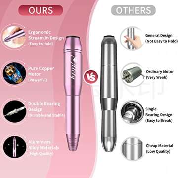 Unlike other electric nail files on the market, the Alety Electric Nail Drill Kit excels in both functionality and aesthetics. While many competitors offer similar powered devices, Alety combines a lightweight, ergonomic design with superior motor performance, producing less noise and heat. Furthermore, the included iridescent drill bits and high-quality sanding bands differentiate this kit from others, providing you with everything needed for a complete manicure.