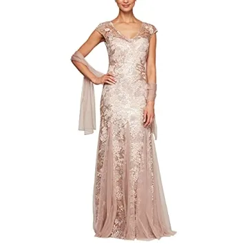 Show more Step into the spotlight with the Alex Evenings Women's Long Fit and Flare Mother of The Bride Dress, a stunning ensemble designed in a gorgeous Rose Gold hue that radiates elegance and charm. Perfectly crafted with meticulous attention to detail, this dress features a chic illusion V-neckline and graceful cap sleeves, making it an ideal choice for any formal occasion. The all-over stretch sequin embroidery ensures not only a touch of shimmer but also unmatched comfort that allows you to dance the night away with ease. A luxurious matching sequin shawl completes the look, providing an element of versatility and elegant coverage for ceremonies and evening celebrations alike. This dress is not just an outfit; it’s a celebration of femininity, designed to make every woman feel special and beautiful.