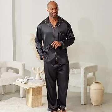 Alexander Del Rossa Mens Satin Pajamas Set, Satin Pajamas for Men, Silk PJs with Matching Sleep Mask Black with Gold Piping Small (A0752BLKSM)