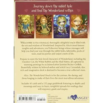 Show moreThe Alice The Wonderland Oracle is an enchanting 45-card oracle deck crafted by the renowned author Lucy Cavendish and the talented artist Jasmin Becket-Griffith. Originally published in 2018 by Blue Angel, this unique deck transports you familiar landscapes inspired by Lewis Carroll's iconic tales of Alice in Wonderland and Through the Looking Glass. This oracle deck is not just another set of cards; it serves as a profound tool for self-reflection and self-discovery, bridging the gap between light and shadow, just as Alice did in her whimsical yet challenging adventures.