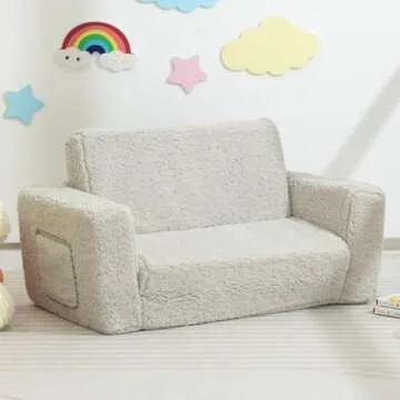 ALIMORDEN Fold Out Toddler Couch, Extra Wide Comfy 2-in-1 Cuddly Sherpa Sofa for Kids, with Removable Baby Friendly Blanket, Convertible Sofa to Bed, Light Grey