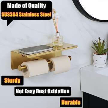 Alise Double Toilet Paper Holder,Bathroom Tissue Holder with Shelf,SUS304 Stainless Steel Toilet Paper Roll Holder Storage Dispenser,Self Adhesive or Wall Mount Drilling Paper Rack,Brushed Golden