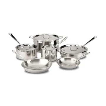 Show more The All-Clad D3 3-Ply Stainless Steel Cookware Set is a culinary masterpiece that unapologetically enhances your kitchen prowess. Designed for those who genuinely appreciate top-notch cooking, this comprehensive 10-piece set includes an array of essential items: 8-inch and 10-inch fry pans, 2-quart and 3-quart covered saucepans, a 3-quart covered sauté pan, and an 8-quart covered stockpot. Crafted with D3 tri-ply technology, each piece boasts exceptional heat distribution and retention, ensuring that your culinary creations achieve optimal results every single time.