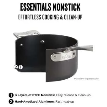Show more The All-Clad Essentials Nonstick Sauce Pan Set brings a new level of culinary excellence to your kitchen. This set includes two beautifully designed saucepans, 2.5 and 4-quart sizes, with high, straight sides that not only retain heat but also minimize evaporation. Perfect for crafting delectable sauces or simply reheating liquids, these pans are engineered for optimum performance. Whether you are a novice cook or a seasoned chef, the heavy gauge aluminum construction ensures consistent and delicious cooking results every time.