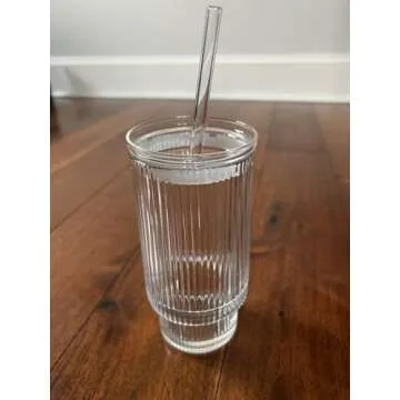 All Glass Ribbed Iced Coffee Cup with Lid and Straw, Glass Tumbler Set of 2 (16 oz)