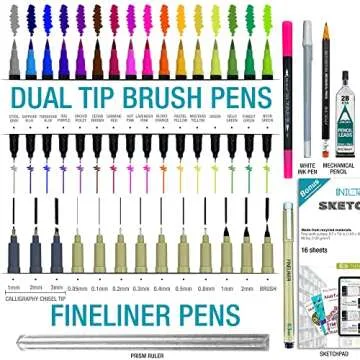 All-in-One Artist Pens for Journaling -16 Dual Tip Brush Pens, 3 Calligraphy Pens, 10 Drawing Pens, Ruler, White Ink Pen, Mechanical Pencil, Sketch Pad Perfect for Coloring Journaling Planner Projects