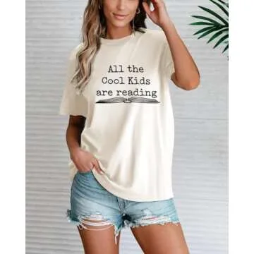 The shirt features a charming graphic print stating ‘All The Cool Kids Are Reading’, which is sure to elicit smiles from fellow book lovers and teachers alike. The classic round neck and summer short sleeves make it a versatile addition to your wardrobe, suitable for pairing with jeans, skirts, leggings, or even overalls.