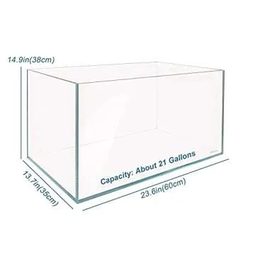 Show moreTransform your living space into a mesmerizing underwater oasis with the Allcolor Ultra Clear Rimless Aquarium Tank. This elegantly designed aquarium boasts a capacity of 21 gallons and is crafted from high-quality low iron glass, offering an unparalleled clarity with a light transmission rate exceeding 91.5%. This exceptional clarity ensures that your aquatic life appears vibrant and lifelike, making it the centerpiece of any room. The rimless construction not only enhances the aesthetic appeal but also maximizes viewing space, allowing you to appreciate your fish and aquascapes without distractions.
