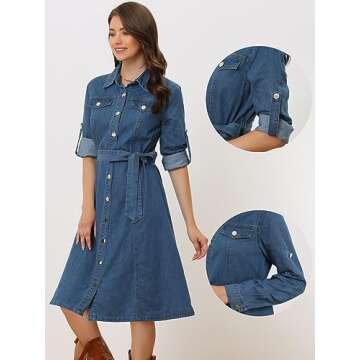 Allegra K Denim Dress for Women's Long Sleeve Button Down A-Line Belted Classic Jean Dresses Large Blue