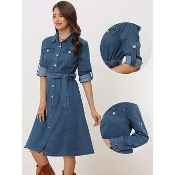 Show more This beautiful jean midi dress is a must-have addition to your wardrobe! Crafted from 100% soft denim, it combines comfort and style perfectly. Designed with a point collar and button-down front, it features long sleeves with button cuffs and a flattering belted waistline, bringing out your best silhouette. This dress is designed to fall below the knee, making it a versatile choice for any occasion, whether you’re at the office or enjoying a casual day out.