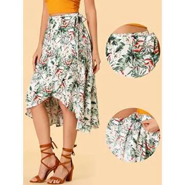 Show moreDiscover the charm of the Allegra K Floral Skirt, a stunning addition to your wardrobe that effortlessly blends tropical vibes with chic style. Crafted from durable 100% polyester, this midi skirt ensures comfort while showcasing a vibrant floral print that embodies the essence of a Hawaiian getaway. Its regular fit design is flattering for various body types, as demonstrated by our model, who is 5'7" and wears size XS. This skirt features multiple eye-catching elements including a sophisticated wrap design, a self-tie closure, and a mid-calf length, making it a versatile choice for both casual and dressy occasions.