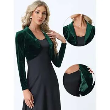 Show moreStep into elegance and comfort with the Allegra K Long Sleeve Shrug Top, a sophisticated cropped cardigan designed specifically for women. Crafted from a luxurious blend of 95% Polyester and 5% Spandex, this velvet bolero shrug combines style with a cozy feel. The open front and shawl collar design, complemented by a curved hem and long sleeves, make it a versatile addition to your wardrobe. Perfectly suited for layering over evening dresses or adding warmth to casual tops, this cardigan flows gracefully with your movements, keeping you stylish without sacrificing comfort.