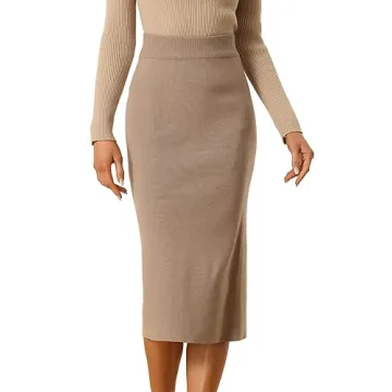 Show moreStep into elegance and comfort with the Allegra K Women's Bodycon Skirt. This high-waisted, stretchy rib knit pencil skirt beautifully combines fashion and functionality, delivering a sophisticated look without sacrificing comfort. The mid-length design hits gracefully at the knee, while the split hem adds a modern twist to a classic silhouette. Made with an exceptional blend of 70% cotton, 20% polyester, and 10% wool, this skirt is soft against your skin, making it perfect for year-round wear. Whether you’re dressing it up for a night out or keeping it casual for a weekend stroll, this versatile piece offers endless styling possibilities.